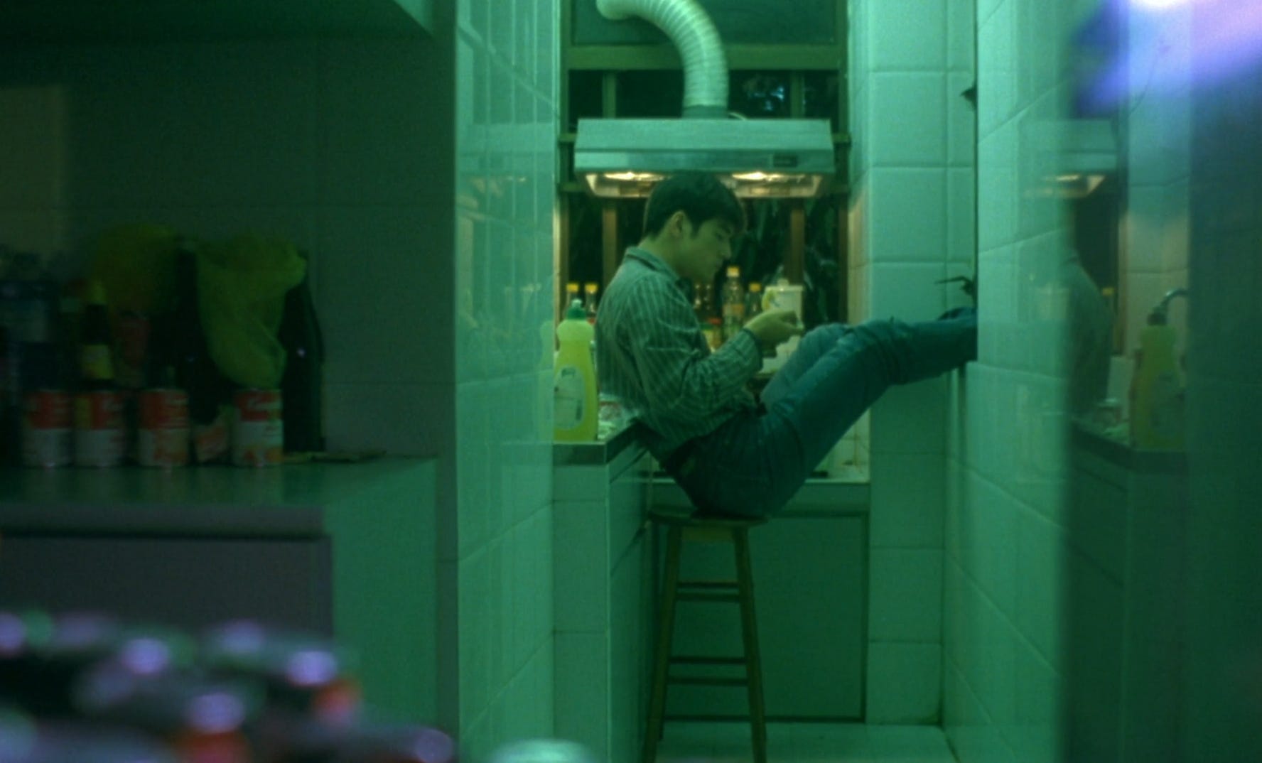 There is no stronger catalyst for this space than love, the central emotion of so many films. We are hard-coded to find love in people, to find love in our surroundings and the things that make us who we are. Hong Kong is, if nothing else, a city of love - this closeness means that everyone and everything are swimming the urban pond of possibility every day and every night, ready for the roll of the dice. We see this closeness in ways both physical and visual, as Wong expertly peers into cramped hallways and through skewed windows. We never see our characters in full frame, only through the openings that the city allows. The geometry shapes how we watch, and shapes the love that can form only out of this natural oddity. He Qiwu in our first story shares this love in ways we are familiar with - the love of material goods and architecture, the love of a lost partner, and new love in a chance encounter. He approaches a blonde woman at a bar, a woman that brushed by him just nights ago as she escaped a drug-trafficking mission gone sour, not knowing just how close their paths intersected. For a single night, they brushed within a centimeter of one another, and life has brought their arcs into tangent once again. They spend the night together, sharing take-out food, shoe shine and stories, before she leaves early in the morning. We see her shoot and kill the drug baron who set her up, just as He Qiwu gets a message on his pager - “May 1st. Happy Birthday”.
